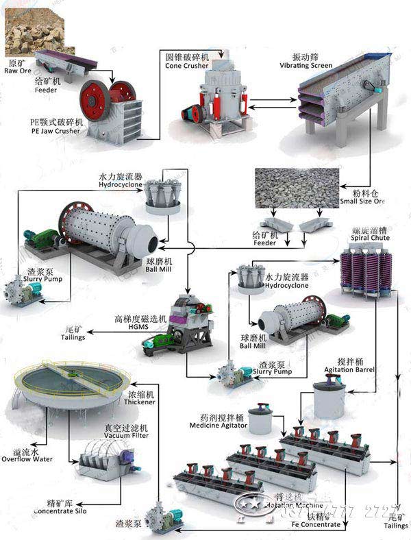 整個(gè)赤鐵礦選礦生產(chǎn)線采用兩段磨礦流程,這樣既能有效地提高生產(chǎn)效率,又能減少資源的浪費(fèi),節(jié)省成本。磨礦第一段選別采用一臺(tái)磁選機(jī),二段選別采用一臺(tái)粗選磁選機(jī)一臺(tái)精選磁選機(jī),既能有效地提高生產(chǎn)產(chǎn)量,又能達(dá)到有效地達(dá)到磨礦細(xì)度,另外,磁選過程中添加了脫磁流程,主要作用是脫去礦物自身所帶的磁性,提高精礦的品味。經(jīng)過磁選機(jī)分選的赤鐵礦物料要被送入浮選機(jī),根據(jù)赤鐵礦的特性加入相應(yīng)的藥劑,將赤鐵礦精礦選別出來,之后將含有大量水分的赤鐵礦物料送入濃縮機(jī)進(jìn)行縮水作業(yè),之后經(jīng)烘干機(jī)烘干即為干燥的成品物料。