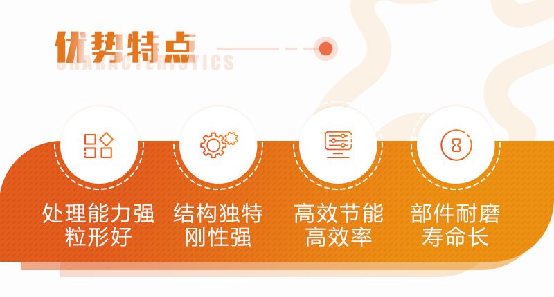 進(jìn)料口大、破碎腔高、適應(yīng)物料硬度高、塊度大、產(chǎn)品石粉少。